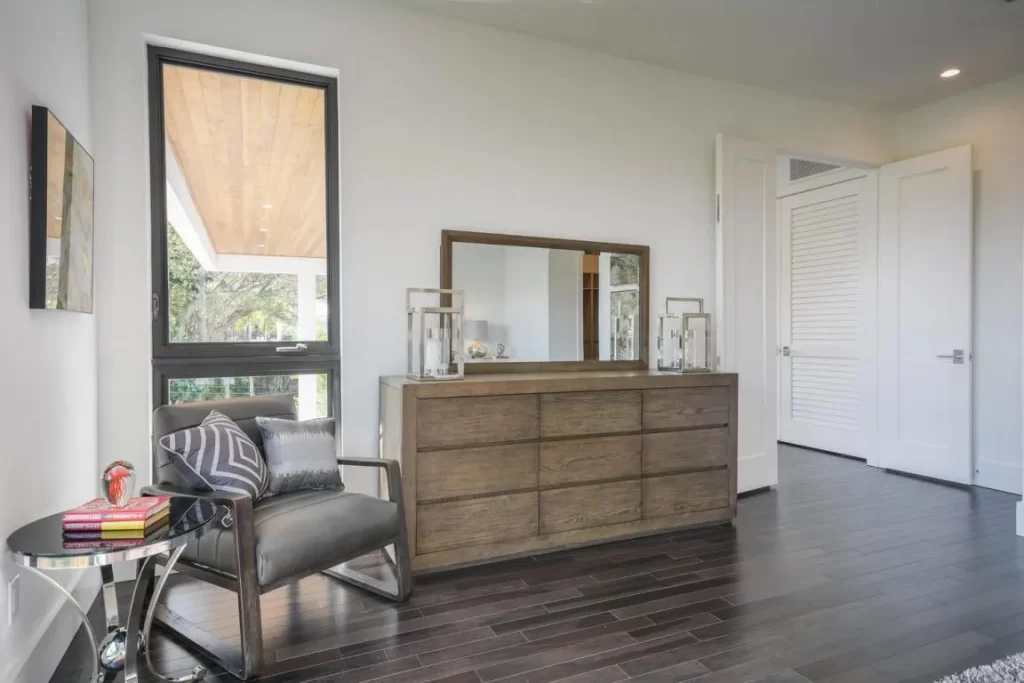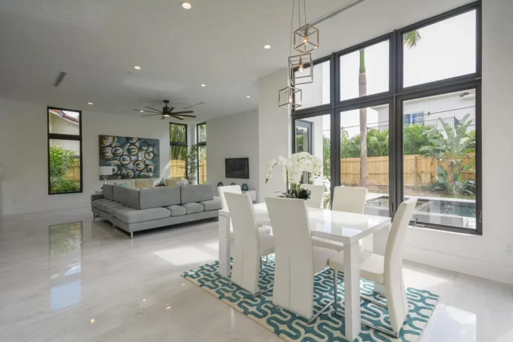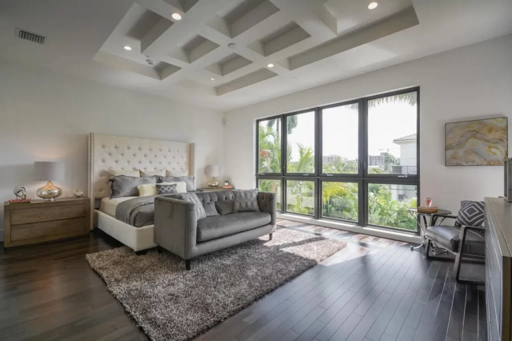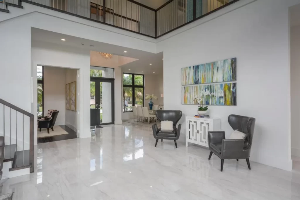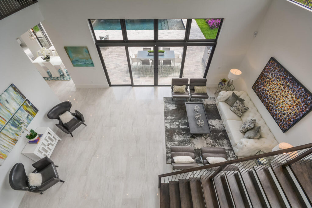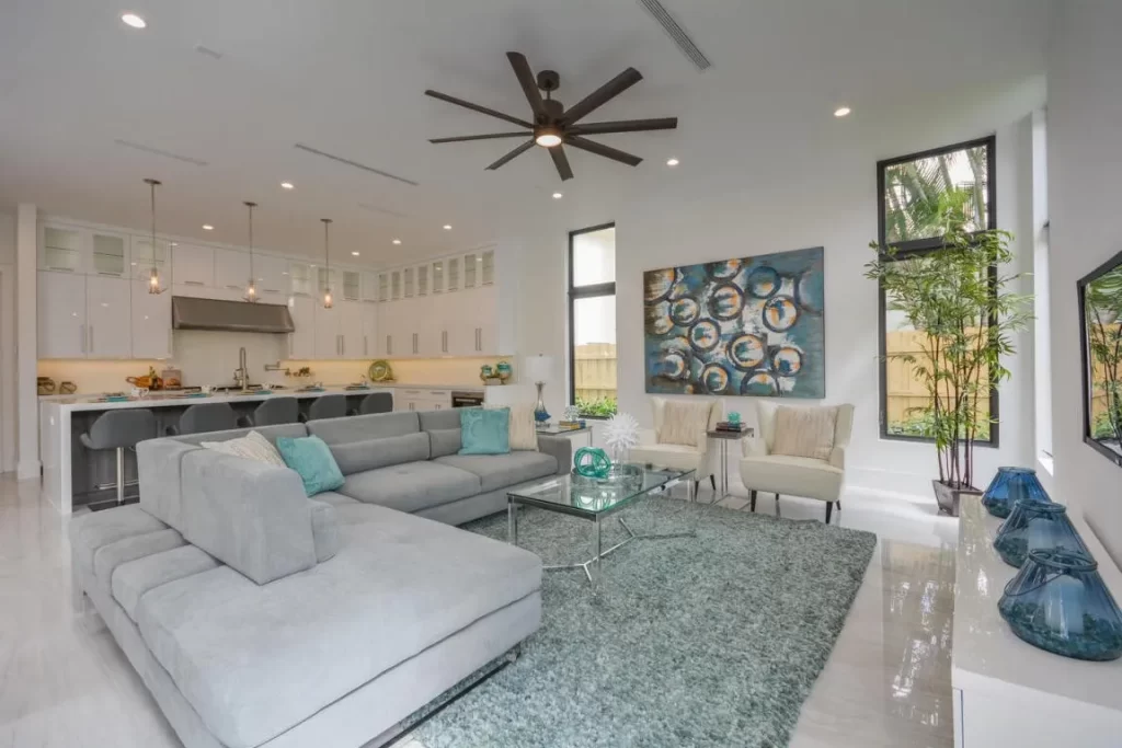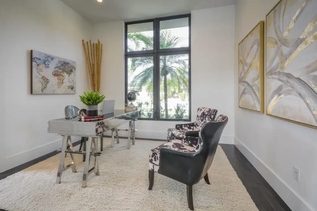 The Contemporary two story home is located in Boca Raton has 5 bedrooms, 4.5bathrooms and many other amenities. The kitchen is equipped with an island bar, pantry, and top of the line appliances made by Wolf and Subzero. Throughout the entire home, you can find high ceilings accompanied by an office, a summer kitchen, a living room, pool and a spa.