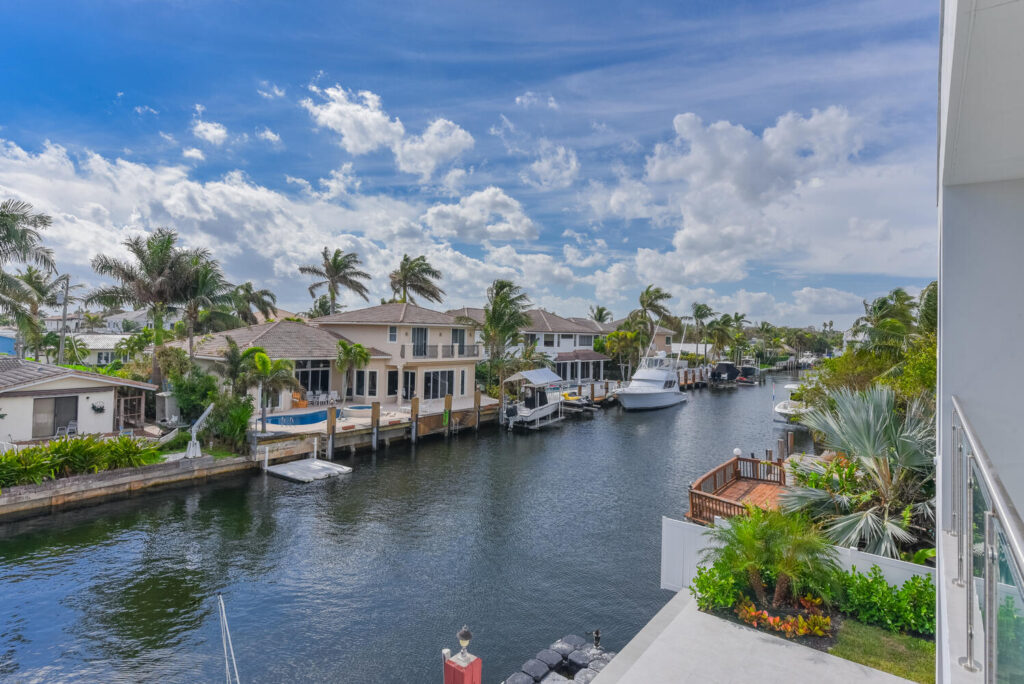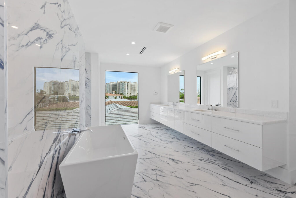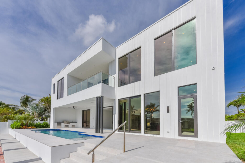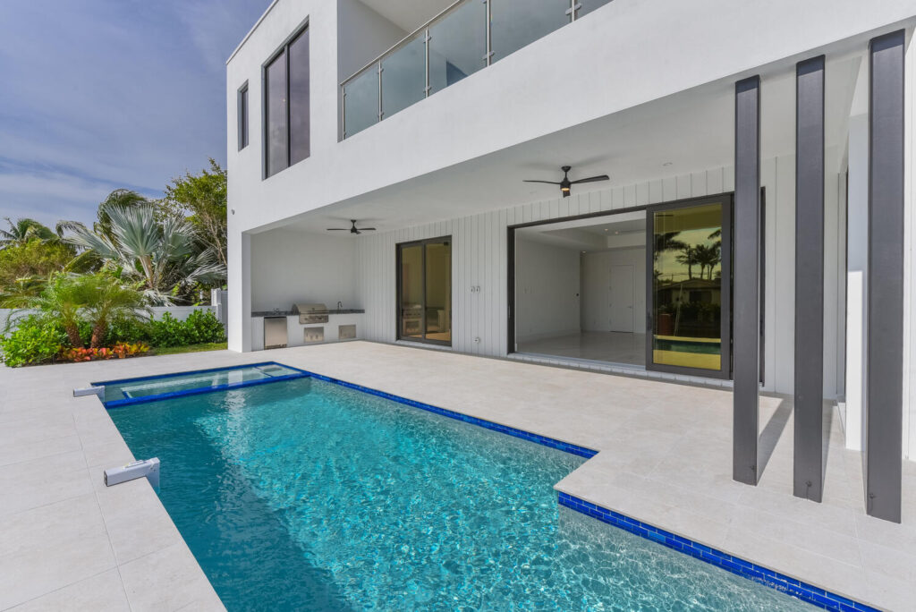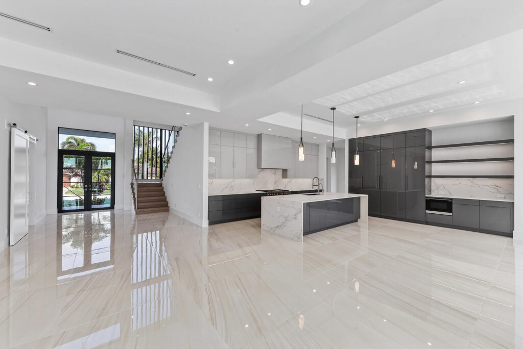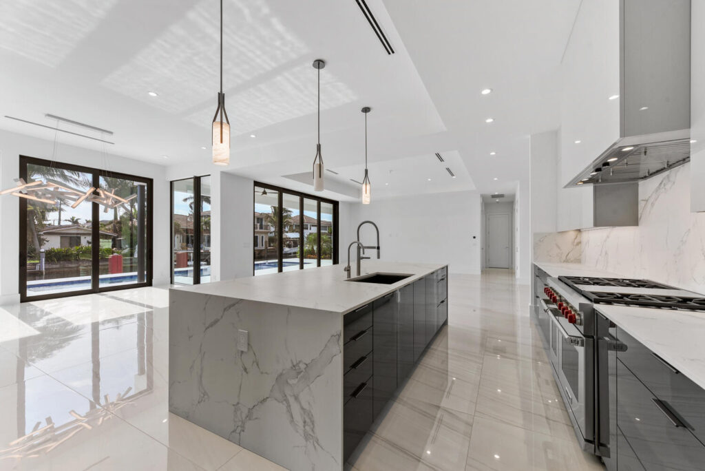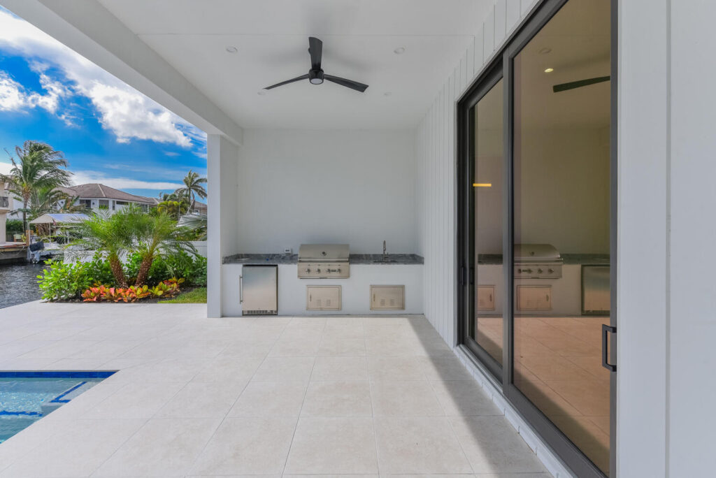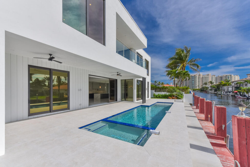 Berkeley Waterfront’s unique design boasts 3 garages, 4 bedrooms, 5.5 bathrooms, office, viewing room, and a second-floor terrace. The state-of-the-art kitchen has an abundance of storage, appliances of the highest quality, and an island with bar top seating. The floor-to-ceiling windows makes the home’s contemporary design even more extravagant as it shows off the gorgeous views of this deepwater location connected to the intracoastal waterway. The grand entrance with soaring ceilings is luring to the upstairs secondary living room and master suits. The private covered loggia offers a summer kitchen, pool, spa and boat dock.