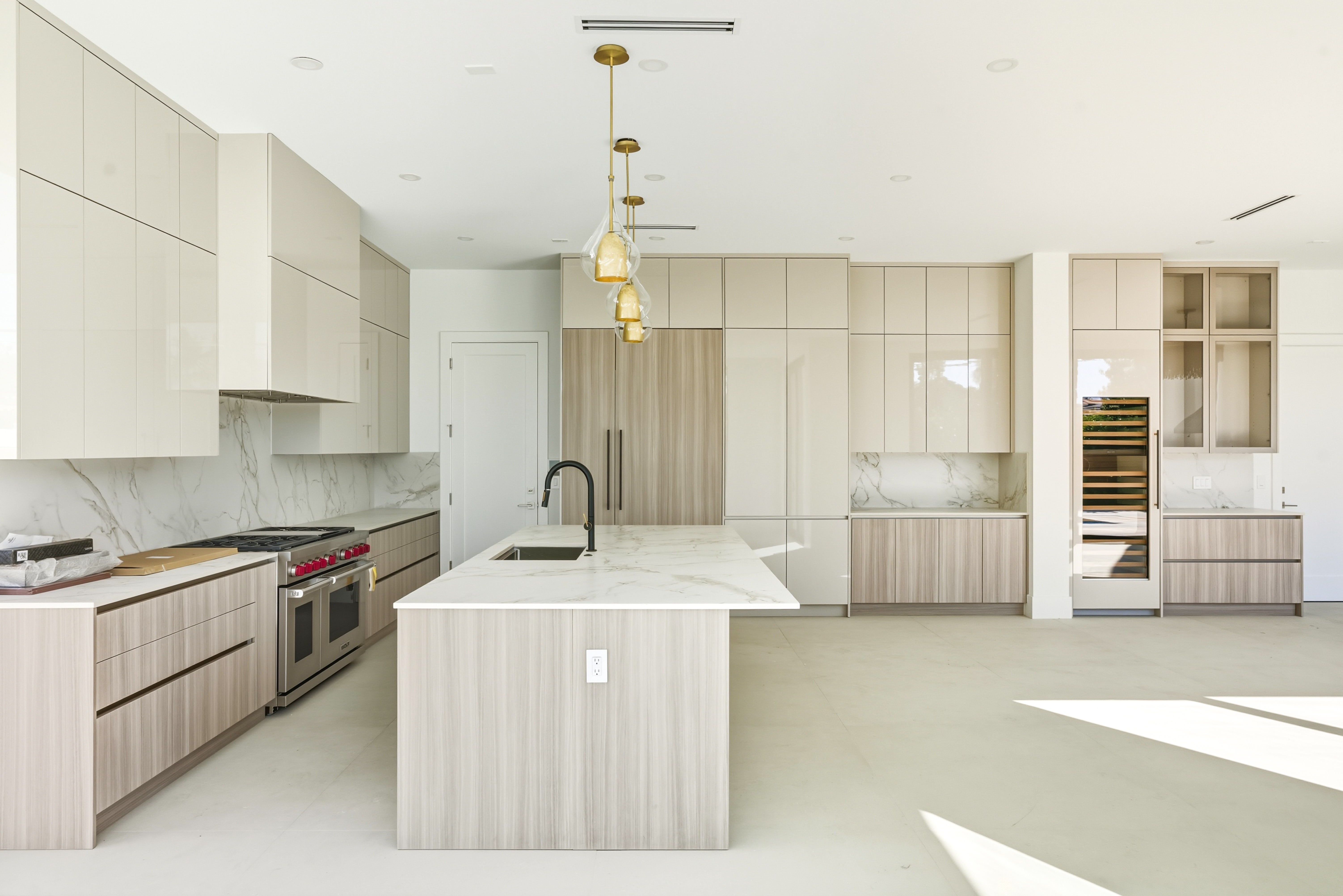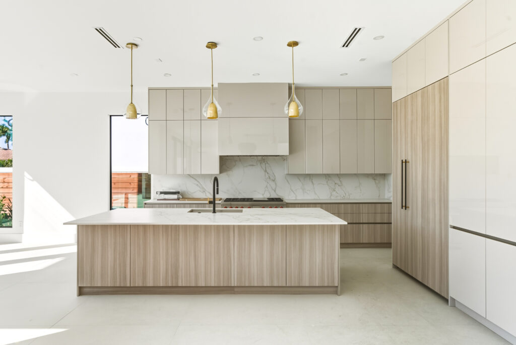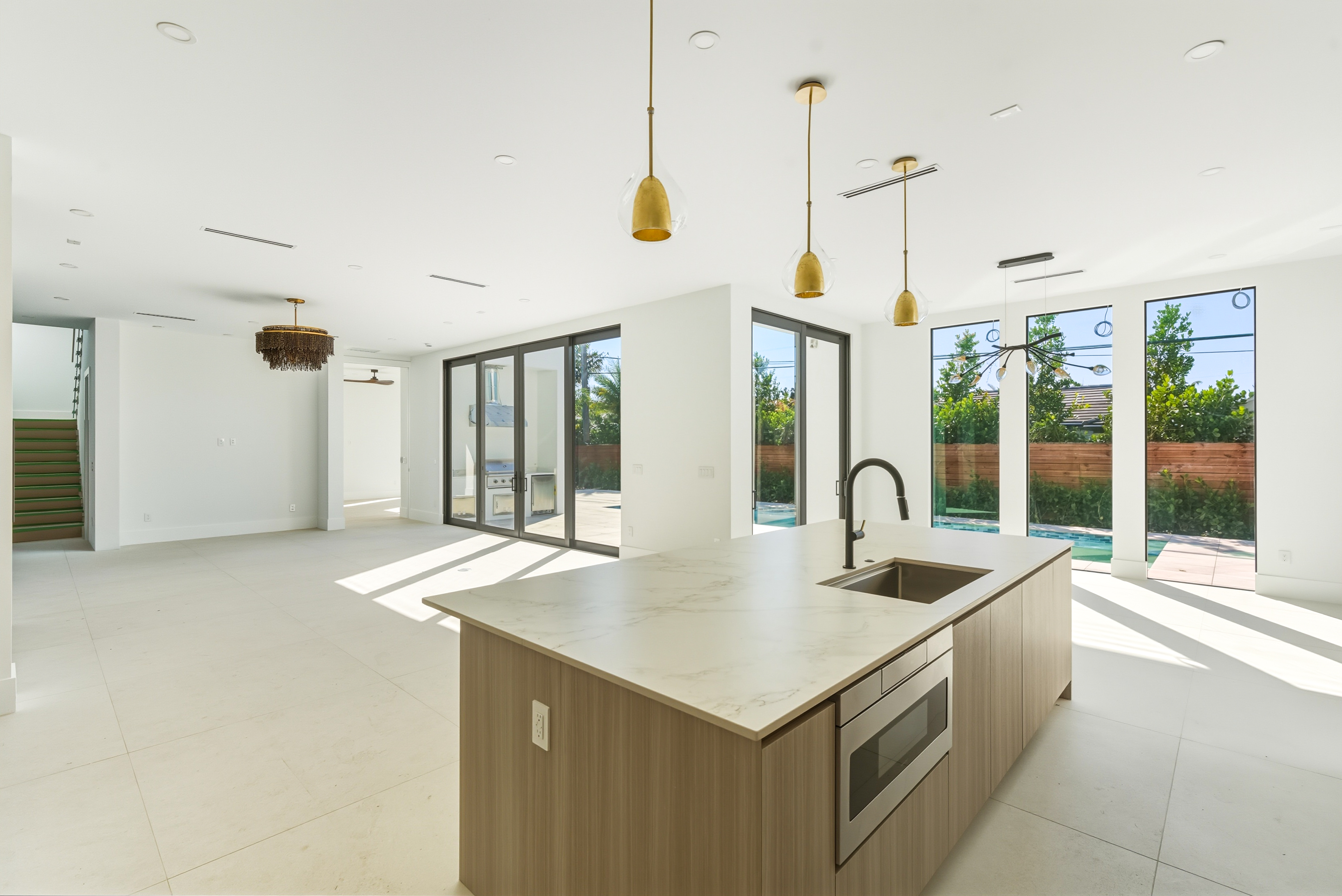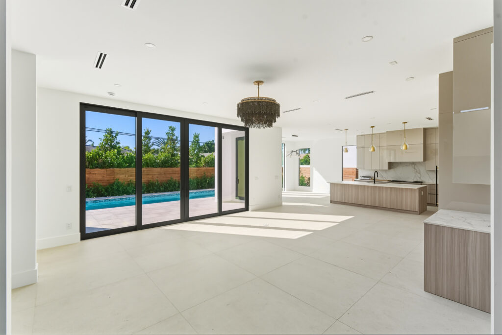 The kitchen is the heart of the home — bright, spacious, and equipped with Wolf and Sub-Zero appliances, custom cabinetry, and sleek Dekton counters. Just beyond, the living area opens completely to the backyard, where a saltwater heated pool and covered patio create a perfect spot for relaxing or entertaining.