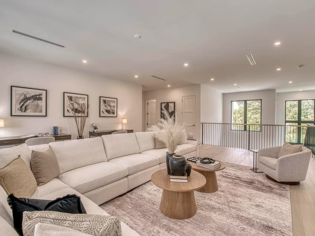 From the moment you step inside, you’ll notice the difference. Sunlight floods through 10-foot sliders. The European white oak floors add warmth and texture. The fireplace wall is bold but inviting. And the kitchen—centered around a waterfall-edge marble island—is ready for everything from casual breakfasts to full-on entertaining. We designed it with Sub-Zero and Wolf appliances, floor-to-ceiling cabinetry, and gorgeous matching countertops and backsplash.