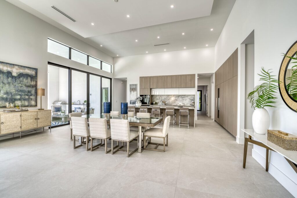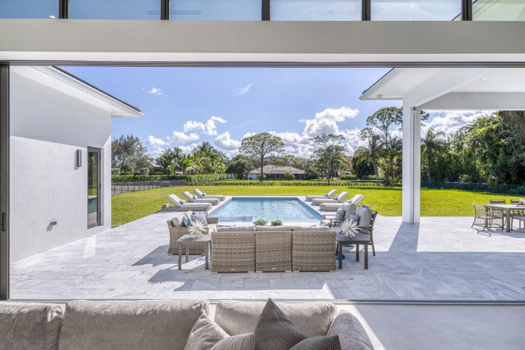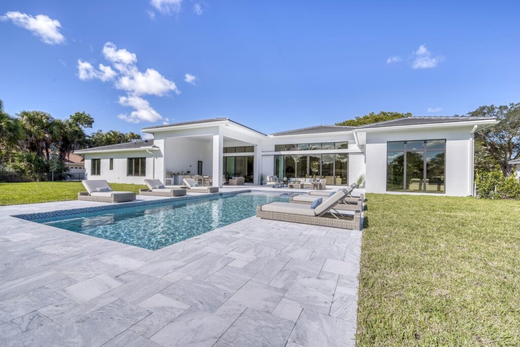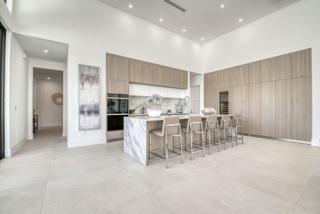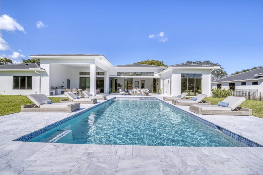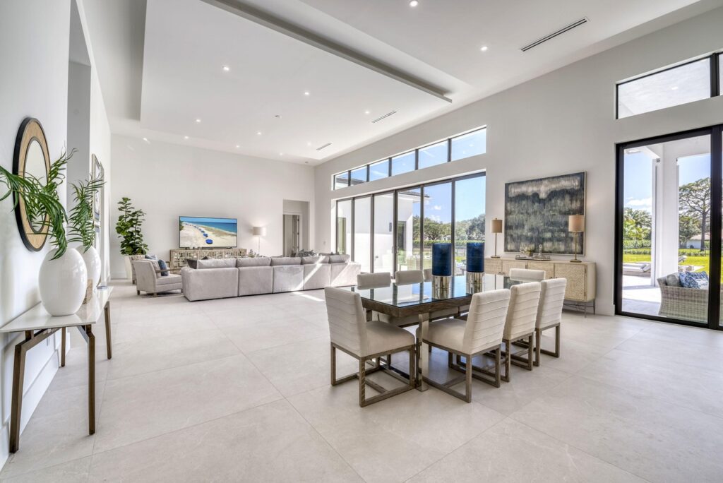 The transitional one story home is located in Palm Beach Gardens has 5 bedrooms, 6 bathrooms and many other amenities. The kitchen is equipped with an island bar, butler’s pantry, pantry, and top of the line appliances made by Wolf and Subzero. Throughout the entire home, you can find 15 foot ceilings accompanied by gym, a Den, a summer kitchen, a living room, and a resort style pool.