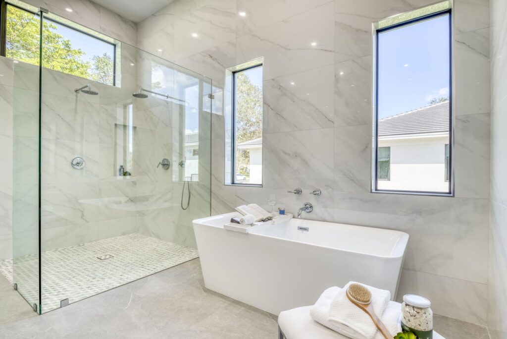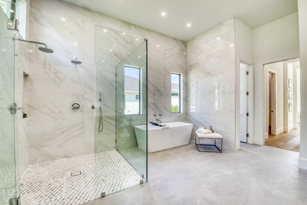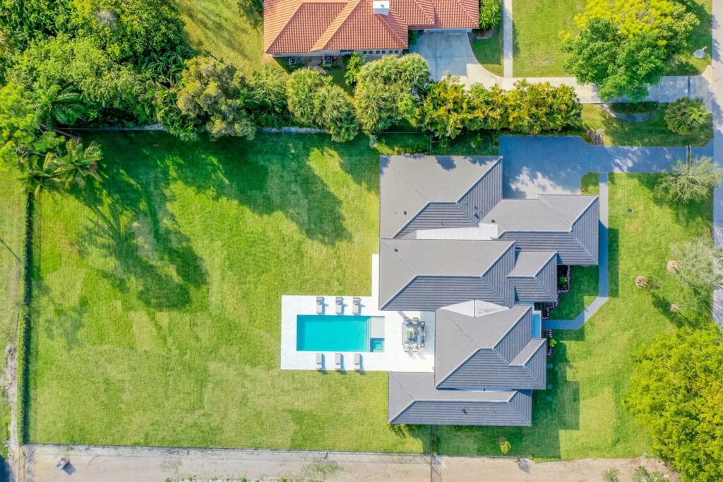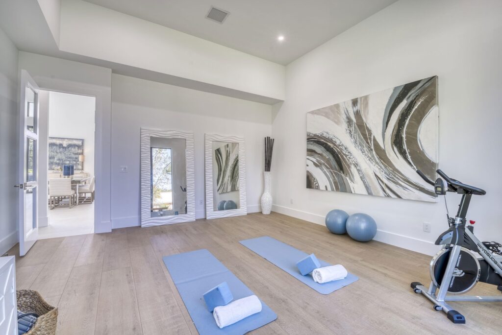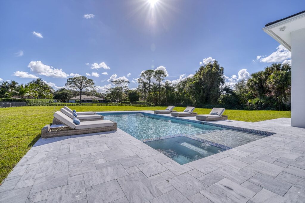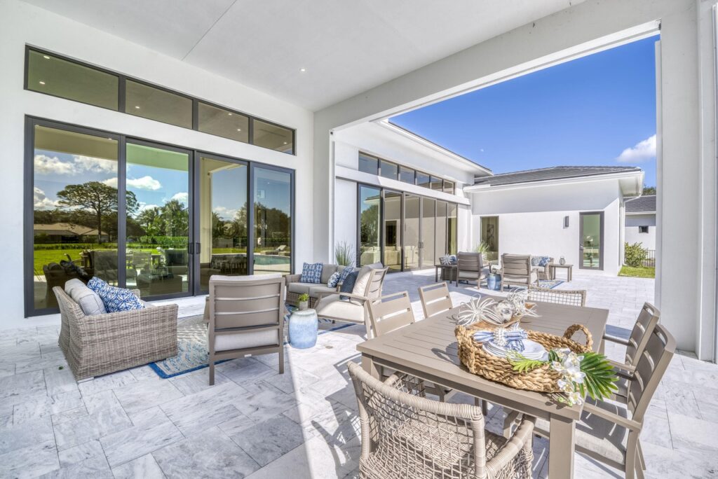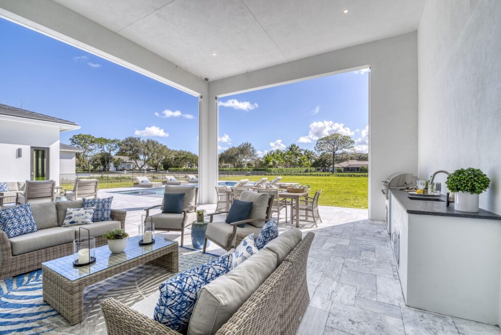 The transitional one story home is located in Palm Beach Gardens has 5 bedrooms, 6 bathrooms and many other amenities. The kitchen is equipped with an island bar, butler’s pantry, pantry, and top of the line appliances made by Wolf and Subzero. Throughout the entire home, you can find 15 foot ceilings accompanied by gym, a Den, a summer kitchen, a living room, and a resort style pool.